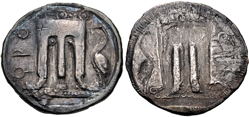 - Nomos de prata, moeda da época de Pitágoras com tripé e garça ao lado. O tripé era usado pelos oráculos nos templos gregos. Os moedeiros usavam a mesma matemática da música de Pitágoras para martelar moedas de prata e ouro nas bigorna.